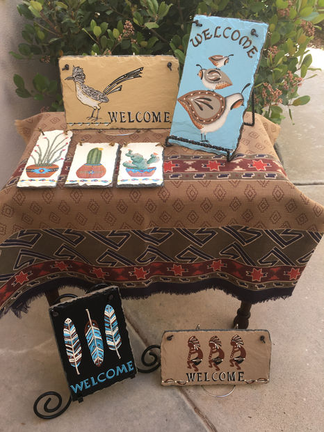 Retiring to Mesilla, NM from Littleton, MA, in 2007, Theresa expanded her hobby into a small business. Old slate roof shingles, tin, and wood are her surfaces of choice, and she has completed decorative painting in local homes, and she added gourd work to her skill set. Theresa is currently a vendor at the Las Cruces Farmers and Crafters Market, a member of the Yucca Pod Painters, and participates in several local craft shows through the year.